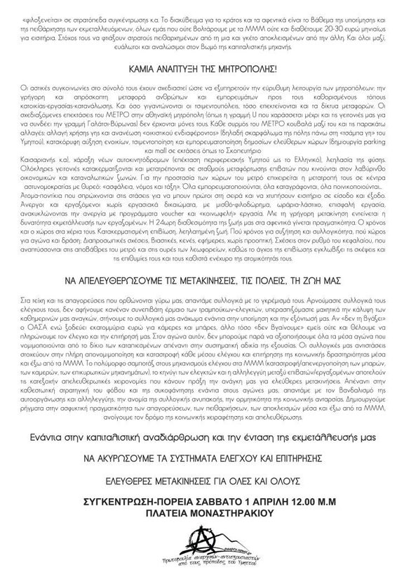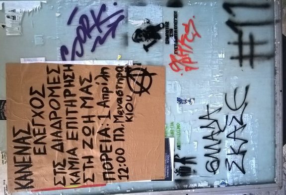 Την Πέμπτη 30/3 το απόγευμα έγινε μοίρασμα στους σταθμούς του μετρό από το Ελληνικό μέχρι τη Δάφνη και μικροφωνική στο μετρό της Δάφνης ενάντια στα νέα μέτρα ελέγχου στα μέσα μαζικής μεταφοράς, καλώντας στην πορεία του Σαββάτου 1/4 στις 12:00 στο Μοναστηράκι.