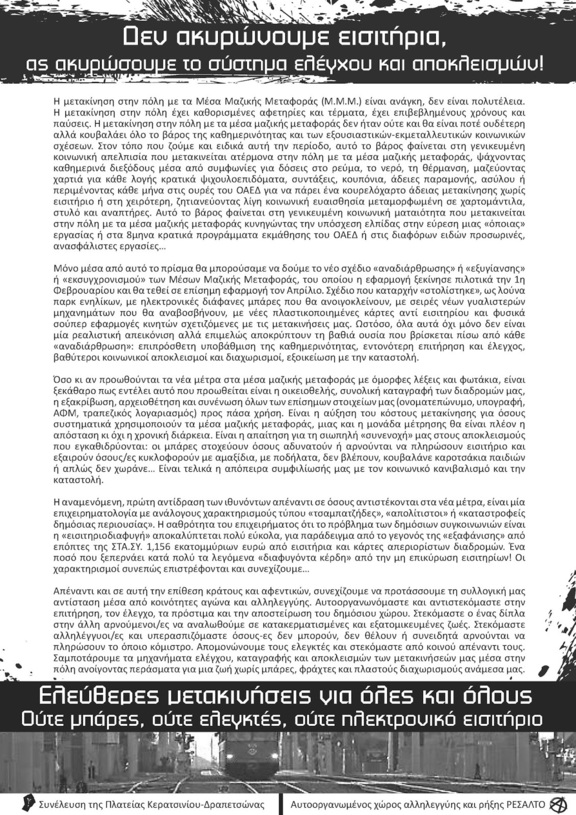 Η ελεύθερη μετακίνηση, ειδικά στη χαοτική μας μητρόπολη, αποτελεί βασική μας ανάγκη και γι' αυτό θεωρούμε δικαίωμα όλων την ελεύθερη πρόσβαση στα μέσα μαζικής μεταφοράς. Δεν θα ανεχθούμε την επιβολή των αποκλεισμών για τους οικονομικά ασθενέστερους, ούτε και την άμεση επίβλεψη κάθε πτυχής της προσωπικής μας ζωής. Προτάσσουμε την αλληλεγγύη μεταξύ των επιβατών απέναντι στο σύμπλεγμα ασφαλείας των μέσων (ελεγκτές, security, μπάτσοι), καθώς και τους από κοινού αγώνες για την κατάργηση των νέων πρακτικών και την διεκδίκηση της δωρεάν πρόσβασης σε όλα τα μέσα μαζικής μεταφοράς.
