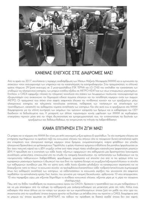 Εναντιωνόμαστε συνολικά στα συστήματα ελέγχου, επιτήρησης και καταστολής. Προτάσσουμε την ελευθερία της μετακίνησης μέσα στη μητρόπολη και προκρίνουμε την αλληλεγγύη μεταξύ των επιβατών.
