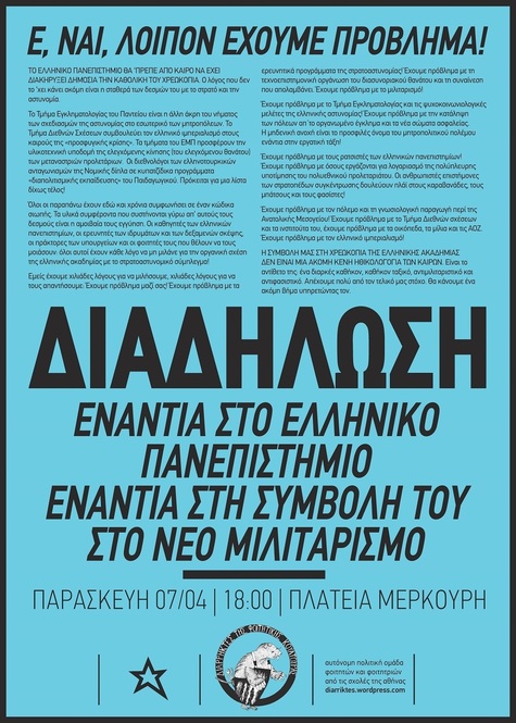 Το Τμήμα Εγκληματολογίας του Παντείου είναι η άλλη άκρη του νήματος των σχεδιασμών της αστυνομίας στο εσωτερικό των μητροπόλεων. Το Τμήμα Διεθνών Σχέσεων συμβουλεύει τον ελληνικό ιμπεριαλισμό στους καιρούς της «προσφυγικής κρίσης». Τα τμήματα του ΕΜΠ προσφέρουν την υλικοτεχνική υποδομή της ελεγχόμενης κίνησης (του ελεγχόμενου θανάτου) των μεταναστριών προλετάριων. Οι διεθνολόγοι των ελληνοτουρκικών ανταγωνισμών της Νομικής δίπλα σε κυπατζίδικα προγράμματα «διαπολιτισμικής εκπαίδευσης» του Παιδαγωγικού. Πρόκειται για μια λίστα δίχως τέλος!
