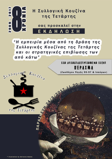 Στις 24/3, ημέρα Παρασκευή και ώρα 20:00, στο στέκι "Πέρασμα" (πρώην "Αυτόνομο Στέκι", Ζωοδόχου Πηγής 95-97 και Ισαύρων), η Συλλογική Κουζίνα της Τετάρτης σάς προσκαλεί σε εκδήλωση με θέμα ''Η εμπειρία από τη δράση της Συλλογικής Κουζίνας της Τετάρτης και οι στρατηγικές επιβίωσης των από κάτω''. Μας ενδιαφέρει, πέρα από το να κάνουμε μια μικρή αναδρομή στην ιστορία της Κουζίνας και έναν μικρό απολογισμό μέχρι σήμερα -ως οφείλει κάθε κινηματική δομή με δημόσια δράση- να συζητήσουμε, διασταυρώνοντας γνώμες και συμπεράσματα,το μέλλον εγχειρημάτων που επιχειρούν να ικανοποιήσουν τις ανάγκες μας εντός, εκτός και ενάντια στη λογική του καπιταλισμού.