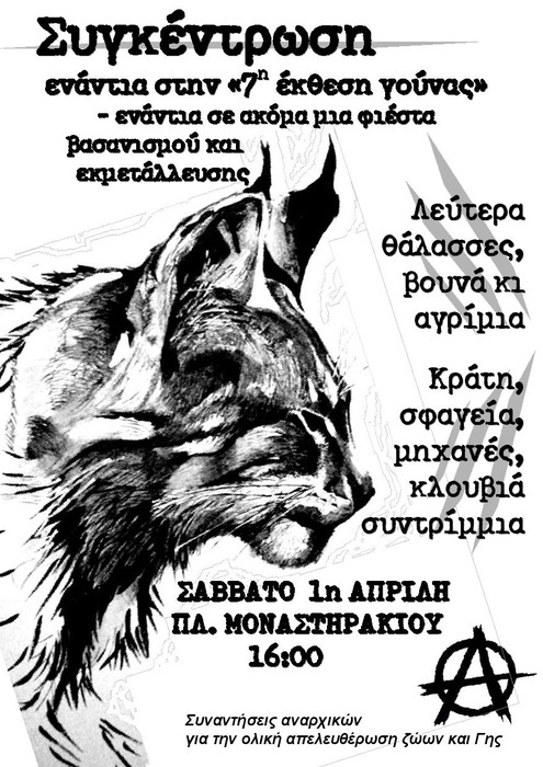 Στις 30 Μαρτίου ξεκινάει η 7η Διεθνής Έκθεση Γούνας, άλλη μια γιορτή όπου η κατανάλωση, η εκμετάλλευση και ο θάνατος έχουν εξέχουσα θέση. Για άλλη μια φορά έμποροι θανάτου θα μαζευτούν για να τιμήσουν ο ένας την "δουλειά" του άλλου, να δώσουν μπράβο και συγχαρητήρια για τα αποτρόπαια έργα τους, να επισυνάψουν εμπορικές συμφωνίες και να κλείσουν μπίζνες πάνω στα πτώματα χιλιάδων βασανισμένων σωμάτων. Σώματα τα οποία, αντιμετωπίζονται ως πρώτη ύλη, ως πηγή παραγωγής εμπορευμάτων, στερημένα από κάθε είδους ελευθερία και αυτοδιάθεση. Τέτοιες καπιταλιστικές "γιορτές" είναι μονάχα κάποιες πιο στολισμένες στιγμές της καθημερινής και χρόνιας εκμετάλλευσης των μη-ανθρώπινων ζώων. Μια εκμετάλλευση η οποία κρατείται φαινομενικά "αόρατη" πίσω από φράχτες και κλειστές πόρτες εργαστηρίων, εκτροφείων, σφαγείων, πίσω από θεαματικές μεθοδεύσεις αντικειμενοποίησης της μη-ανθρώπινης ζωής ως εμπόρευμα-αγαθό. Αντιλαμβανόμαστε τον εγκλεισμό ανθρώπινων και μη-ανθρώπινων ζώων ως κομμάτι του ίδιου εξουσιαστικού μηχανισμού του σύγχρονου πολιτισμού. Επιλέγουμε να μην εθελοτυφλούμε. Παίρνουμε θέση πολέμου ενάντια στην αδιαφορία, την εκμετάλλευση σε κάθε μορφή της και τις εξουσιαστικές σχέσεις που αναπαράγει η κυριαρχία.
