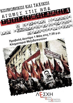 Η Λέσχη Εργασίας, Αλληλεγγύης & Πολιτισμού, στα πλαίσια του εορτασμού της Εργατικής Πρωτομαγιάς, θα προβάλλει τη Δευτέρα 1 Μάη, στις 7:30 μ.μ. στην Κληματαριά Μεζεδοποτείον, το ντοκιμαντέρ "Ταξισυνειδησία: η άγνωστη ιστορία του ελληνομαερικανικού ριζοσπαστισμού".