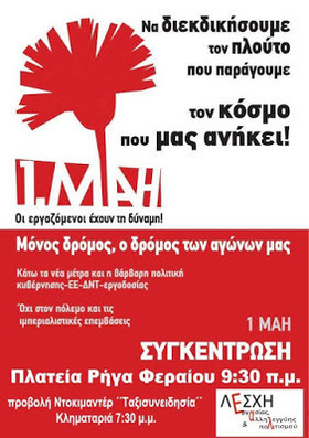 Η εργατική Πρωτομαγιά πρέπει να αποτελέσει σταθμό για την ταξική - αγωνιστική ανασυγκρότηση στο εργατικό και συνδικαλιστικό κίνημα που δρα από τη σκοπιά της υπεράσπισης της εργατικής τάξης και της συνολικής της χειραφέτησης. Ενάντια στη νέα συμφωνία και το νέο Μνημόνιο διαρκείας που φέρνει κι αυτή η κυβέρνηση, συνεχίζοντας την καταστροφική πολιτική όλων των προηγούμενων. Για την αποτροπή του ιμπεριαλιστικού πολέμου. Για να διεκδικήσουμε ριζικές αυξήσεις στους μισθούς και τις συντάξεις, Συλλογικές Συμβάσεις παντού με μείωση του εργάσιμου χρόνου. Για μόνιμη και σταθερή δουλειά με πλήρη δικαιώματα, ενάντια στις ελαστικές εργασιακές σχέσεις και τον κοινωνικό μεσαίωνα. Να φωνάξουμε «κάτω τα χέρια» από τα δημόσια κοινωνικά αγαθά και τα λαϊκά σπίτια, ενάντια στις ιδιωτικοποιήσεις και τους πλειστηριασμούς. Να επιβάλλουμε σύγχρονα δημοκρατικά δικαιώματα και ελευθερίες, απέναντι στον αυταρχισμό, την εργοδοτική τρομοκρατία και την κρατική καταστολή. Να παλέψουμε μαζί με τους εργαζόμενους όλου του κόσμου, τους μετανάστες και πρόσφυγες, τους λαούς, για την ειρήνη και την αλληλεγγύη, ενάντια στους πολέμους και τις επεμβάσεις τους! Για να βγούμε από τη φυλακή της ΕΕ και του ΔΝΤ, να διαγράψουμε το ληστρικό χρέος και να πληρώσει το κεφάλαιο για την κρίση.