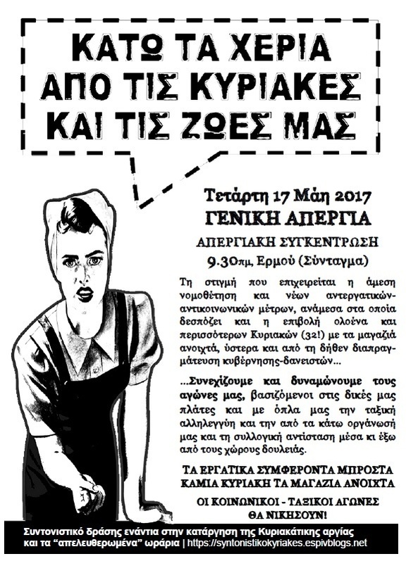 Τετάρτη 17 Μάη 2017 :: Γενική Απεργία | Συγκέντρωση: 9.30πμ, Ερμού | Κάτω τα χέρια από τις Κυριακές και τις ζωές μας!