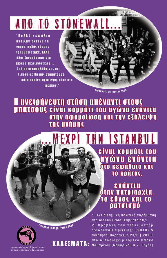 As part of an effort of recent year to constitute a radical pole of political intervention in the existing institutional Pride, last year we created the queer feminist initiative Queer Ntekapaz, aiming at Athens Pride's designation as a mirror of domination with a structurally and constitutively institutional character. This year, we reconstructed our assembly with the same foundations and goals, and we invite all our comrades to coordinate together a collective political intervention, where everybody can come with their own production of discourse and materials.