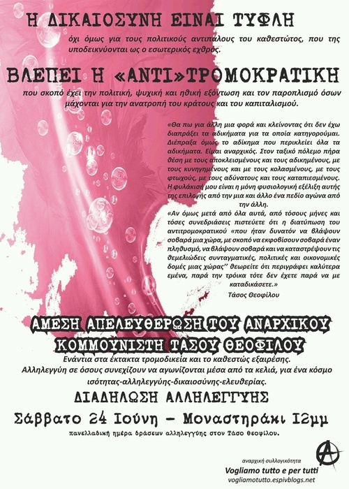 24 Ιούνη ημέρα πανελλαδικής δράσης για την δίωξη του αναρχικού κομμουνιστή Τάσου Θεοφίλου.
