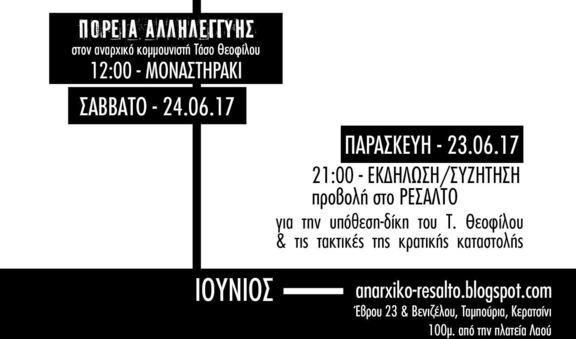 Το Σάββατο 24 Ιούνη, στις 12 το μεσημέρι, οργανώνεται από το Μοναστηράκι πορεία αλληλεγγύης στον αναρχικό κομμουνιστή Τάσο Θεοφίλου, η δίκη του οποίου σε δεύτερο βαθμό βαδίζει προς το τέλος της (στην επόμενη συνεδρίαση θα αγορεύσουν οι συνήγοροι υπεράσπισης και μετά θα αναμένεται η απόφαση του Πενταμελούς Εφετείου Κακουργημάτων). «Μπορεί να μην ήταν ο άνθρωπος στη ληστεία» είχε είπε πρωτόδικα ο «σεναριογράφος» της Αντιτρομοκρατικής Ε. Χαρδαλιάς. «Μπορεί να μη φόρεσε το καπέλο» είχε παραδεχτεί ο πρόεδρος του πρωτόδικου Μ. Χατζηαθανασίου. Παρά ταύτα, ο Τάσος Θεοφίλου καταδικάστηκε για τη ληστεία στην Πάρο και ως συνεργός στην ανθρωποκτονία του ταξιτζή Μίχα και ξαναδικάζεται ακόμα και για συμμετοχή στη ΣΠΦ, επειδή η εισαγγελία έκανε έφεση στην απαλλακτική γι' αυτή την κατηγορία πρωτόδικη απόφαση. Οι μηχανισμοί έδειξαν αποφασισμένοι να στείλουν για πολλά χρόνια (ει δυνατόν και ισόβια) στη φυλακή τον αγωνιστή που στοχοποίησε η Αντιτρομοκρατική.