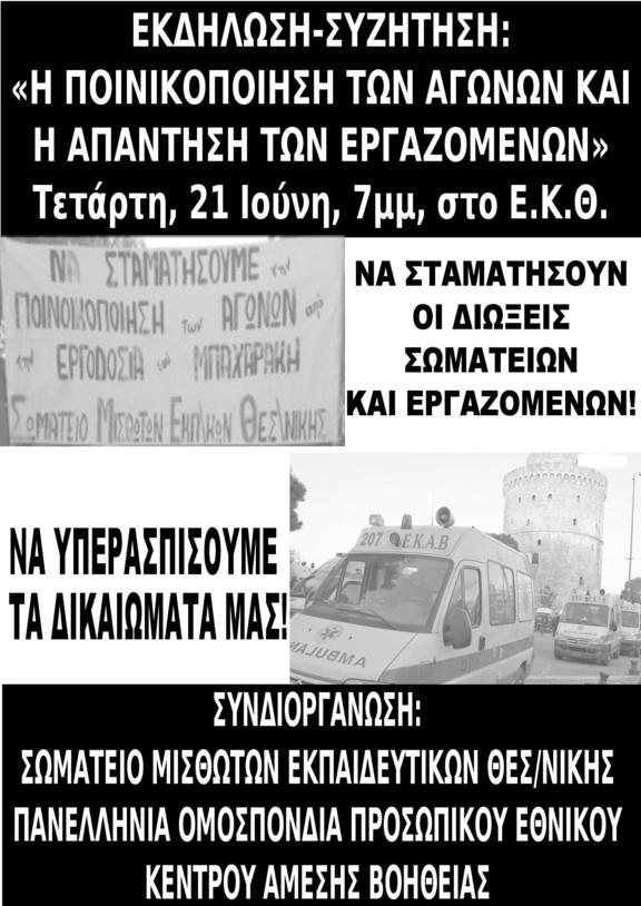 Αντιμέτωποι με αυτήν την προσπάθεια ποινικοποίησης των αγώνων βρέθηκαν τόσο οι εργαζόμενοι και το Σωματείο των εργαζομένων στο Ε.Κ.Α.Β., όσο και οι εργαζόμενοι εκπαιδευτικοί σε φροντιστήρια κ.α. μέλη του Σωματείου Μισθωτών Εκπαιδευτικών Θεσσαλονίκης (Σ.Μ.Ε.Θ.). Κοινός τόπος και στις δύο περιπτώσεις, είναι η αγωνιστική διεκδίκηση των εργατικών δικαιωμάτων και η απαίτηση καταβολής των δεδουλευμένων. Η αντίδραση τόσο από την διοίκηση του ΕΚΑΒ (επί της ουσίας του δημοσίου) όσο και από την εργοδοσία των φροντιστηρίων Μπαχαράκη ήταν η δικαστική δίωξη των εργαζομένων και των Σωματείων, η προσπάθεια ποινικοποίησης της συνδικαλιστικής δράσης και η επιβολή εξοντωτικών χρηματικών ποινών.