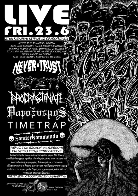 Τελευταίο σκηνικό πριν καλοκαιριάσει για τα καλά, σε συνδιοργάνωση με τα παιδιά από την Κατάληψη Κτήματος Πραποπούλου στο εξωτικό Χαλάνδρι (Πεζόδρομος Προφήτη Ηλία 49, απέναντι από το Θέατρο Ρεματιάς). 15:00 με 17:00 κουβέντα με θέμα "Αυτοοργανωμένα Μαθήματα: δυνατότητες, δυναμικές, δυσκολίες". Απο τις 15:00 συλλογική κουζίνα, Bookstro με βιβλία, Distro. 19:30 με 00:30 (αυστηρά λόγω γειτονιάς) live με τους: Never Trust (Thrascore / Αθήνα) Ουστ! (Punk / Αθήνα) Procrastinate (Crust / Καρδίτσα) Παροξυσμός (Crust-Punk / Αθήνα) TimeTrap (Hardcore / Αθήνα) Sonderkommando (Street Punk / Αθήνα) Μέρος των εσόδων θα διατεθούν για την κάλυψη ιατρικών εξόδων συντρόφισσας. Οικονομική ενίσχυση απαραίτητη! * Οι καταληψεις και οι αυτοοργανωμενοι χωροι δεν ειναι η ψευδαισθηση μιας νησιδας ελευθεριας μεσα στον ωκεανο της καπιταλιστικης κυριαρχιας. Ειναι ο χωρος στον οποιο εδαφικοποιειται η δραση, η αντισταση και δημιουργικοτητα μας εναντια στις κυριαρχικες δομες και μηχανισμους καθε ειδους τυπικης ή ατυπης εξουσιας.