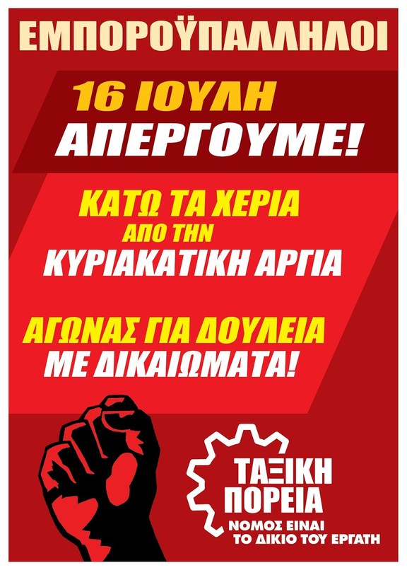 Κυριακή 16 Ιούλη: Πανελλαδική απεργία στο εμπόριο - Απεργιακή συγκέντρωση: 10 π.μ., Ερμού (Σύνταγμα)