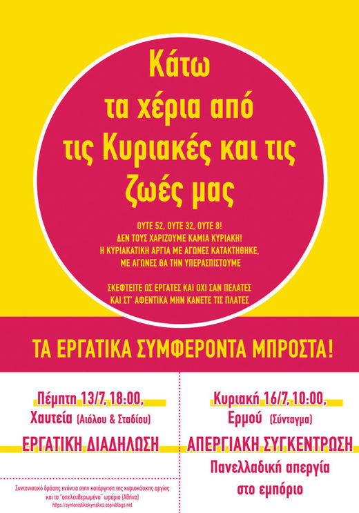 Κινητοποιήσεις ενάντια στην κατάργηση της κυριακάτικης αργίας (13 & 16/7)