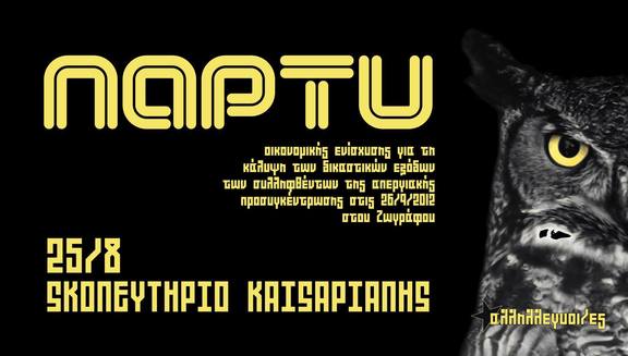 Πάρτυ οικονομικής ενίσχυσης για κάλυψη δικαστικών εξόδων των συλληφθέντων της 26/9/2012 την Παρασκευή 25/8 από τις 23.00 και μετά στο Σκοπευτήριο Καισαριανής
