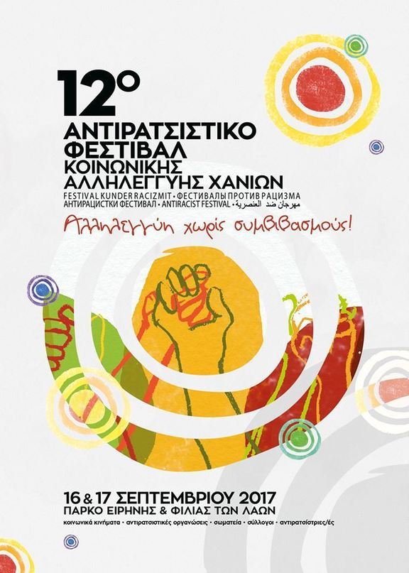 Στο 12ο Αντιρατσιστικό Φεστιβάλ Κοινωνικής Αλληλεγγύης Χανίων όλοι εμείς οι «από τα κάτω» ενώνουμε τις φωνές μας. Συζητάμε και ενημερωνόμαστε για τα ζητήματα που μας αφορούν, οργανώνουμε τις αντιστάσεις μας, ακούμε ήχους και χορεύουμε σε ρυθμούς από όλο τον κόσμο.