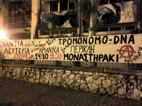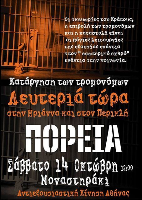 Ανακοίνωση - κάλεσμα για την πορεία στις 14/10 και την παράσταση έξω από το Εφετείο 16/10. Η απόρριψη αναστολής εκτέλεσης ποινής της Ηριάννας Β. Λ. και του Περικλή Μ., ήταν μία ακόμη όψη μίας δικαστικής εξουσίας που επιχειρεί να μετρήσει ένα πολύ σοβαρό βήμα στην ποινικοποίηση της ριζοσπαστικής κοινωνικής δράσης, ενώ στο στόχαστρό της μπαίνουν πλέον ακόμα και οι προσωπικές σχέσεις. Από πλευράς ΣΥΡΙΖΑ τα κροκοδύλια δάκρυα για το άδικο της απόρριψης αναστολής, είναι απλά ένα κακόγουστο θέατρο κεντημένο με «αριστερούς» ουμανιστικούς μονολόγους περί της έννοιας του δικαιώματος. Θα πρέπει ωστόσο να γίνει κατανοητό ότι η συγκυβέρνηση ΣΥΡΙΖΑ - ΑΝΕΛ, φέρει την κεντρική πολιτική ευθύνη, καθώς άφησε απείραχτο όλο το κεκτημένο της «αντιτρομοκρατικής νομοθεσίας», αποδεικνύοντας ότι είτε το θες είτε όχι, στα πλαίσια της συνέχειας του κράτους, των μνημονίων και αυτής της πολιτικής, ο αυταρχισμός και η καταπάτηση των στοιχειωδών δημοκρατικών δικαιωμάτων και των λαϊκών ελευθεριών γίνεται όρος υλοποίησης των αντιλαϊκών πολιτικών.