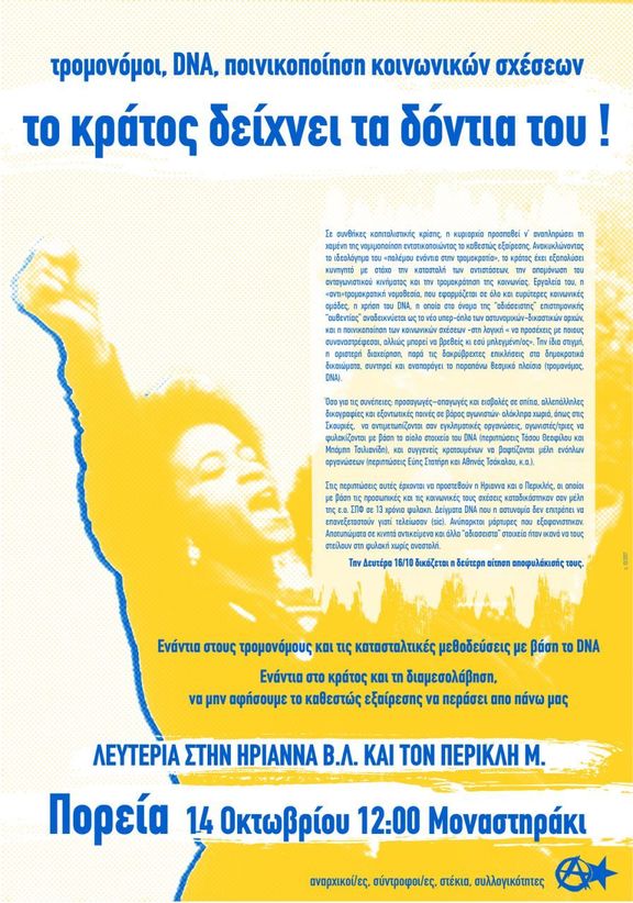 Σε συνθήκες καπιταλιστικής κρίσης, η κυριαρχία προσπαθεί ν' αναπληρώσει τη χαμένη της νομιμοποίηση εντατικοποιώντας το καθεστώς εξαίρεσης. Ανακυκλώνοντας το ιδεολόγημα του «πολέμου ενάντια στην τρομοκρατία», το κράτος έχει εξαπολύσει κυνηγητό με στόχο την καταστολή των αντιστάσεων, την απομόνωση του ανταγωνιστικού κινήματος και την τρομοκράτηση της κοινωνίας. Εργαλεία του, η «αντι»τρομοκρατική νομοθεσία, που εφαρμόζεται σε όλο και ευρύτερες κοινωνικές ομάδες, η χρήση του DNA, η οποία στο όνομα της "αδιάσειστης" επιστημονικής "αυθεντίας" αναδεικνύεται ως το νέο υπερ-όπλο των αστυνομικών-δικαστικών αρχών, και η ποινικοποίηση των κοινωνικών σχέσεων -στη λογική « να προσέχεις με ποιους συναναστρέφεσαι, αλλιώς μπορεί να βρεθείς κι εσύ μπλεγμένη/ος». Την ίδια στιγμή, η αριστερή διαχείρηση, παρά τις δακρύβρεχτες επικλήσεις στα δημοκρατικά δικαιώματα, συντηρεί και αναπαράγει το παραπάνω θεσμικό πλαίσιο (τρομονόμος, DNA).