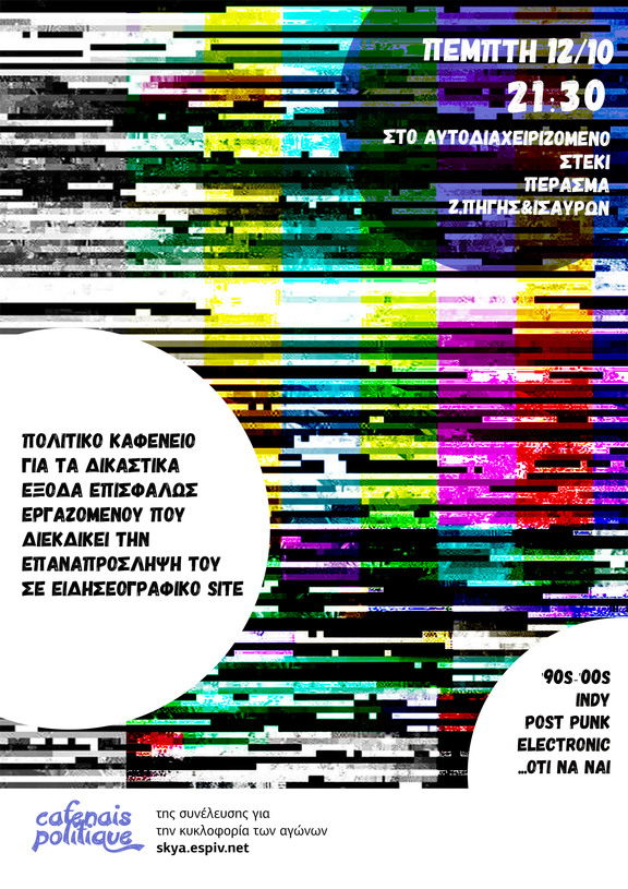 Το πρώτο πολιτικό καφενείο της σκυα για την φετινή χειμερινή σαιζόν συνδυαζεται με έναν ευγενή προλεταριακό σκοπό. Την κάλυψη μέρους των δικαστικων εξόδων, μέλους της συνέλευσης και επισφαλώς εργαζόμενου/άνεργου που διεκδικεί μέσω της δικαστικού οδού εδώ και 7 χρόνια την επαναπρόσληψη του με σύμβαση συντακτων σε ειδησεογραφικό site από το οποίο απολύθηκε (για την υπόθεση βλ. https://skya.espiv.net/2017/10/05/dealnews_st…). Ως προς το μουσικό περιεχόμενο το καφενείο φιλοδοξει (με την παρουσία δυο εκ των διασημότερων ντιτζει των στενών των Εξαρχείων/Νεάπολης) να συσπειρώσει την γενιά των πάνω-κάτω 30φευγα, που οι μουσικές αναμνήσεις τους διχοτομούνται μεταξύ της δεκαετίας των 90ς και αυτής των 00ς και το εύρος των μουσικών τους ακουσμάτων κινούνται από το indy και το post punk (γι αυτούς που θα ρθουν νωρίς) μέχρι την ηλεκρονική σκηνή και το μουσικό είδος που ορίζουμε ως "ότι να ναι" (για πιο αργά). Η διάθεση είναι γιορτινή/χορευτική, τα λεφτά που ζητούνται αρκετά, η καμπή κρίσιμη και τα αφεντικά βρισκονται στριμωγμένα στην γωνία περιμενοντας με αγωνία να γίνει ένα συνηθισμένο, ξενέρωτο μάζεμα σε ένα υπόγειο των εξαρχείων. Ας μην τους κάνουμε την χάρη και ας τους ευχηθούμε ολόψυχα κακό χειμώνα.