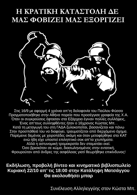 Εκδήλωση και προβολή βίντεο για την επίθεση αστυνομικών κατά του Κώστα Μπ.
