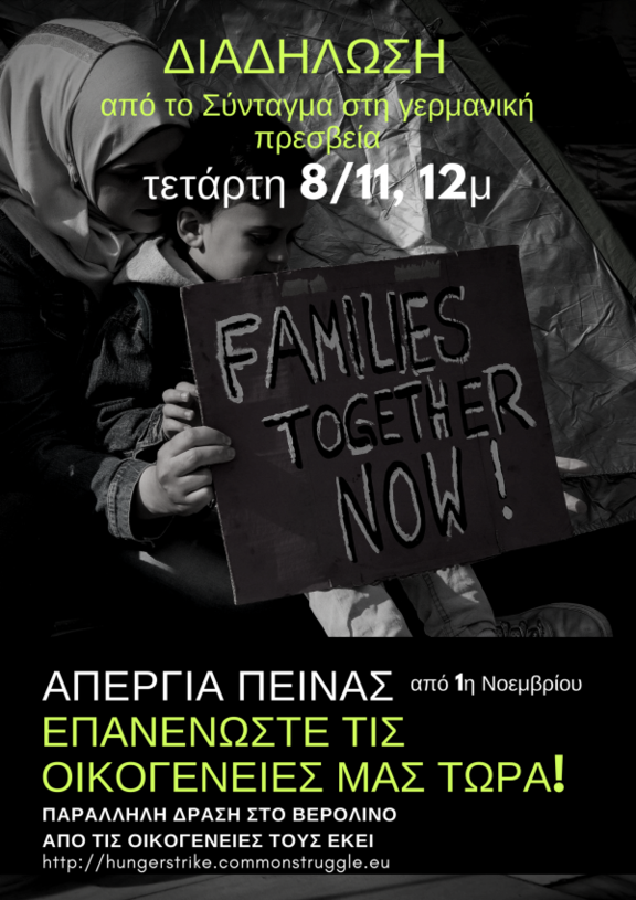 Άμεση επανένωση των προσφυγικών οικογενειών. Νίκη στον αγώνα των απεργών πείνας! Όλοι/ες στη πορεία προς τη γερμανική πρεσβεία, από το Σύνταγμα στις 8/11 στις 12 π.μ.