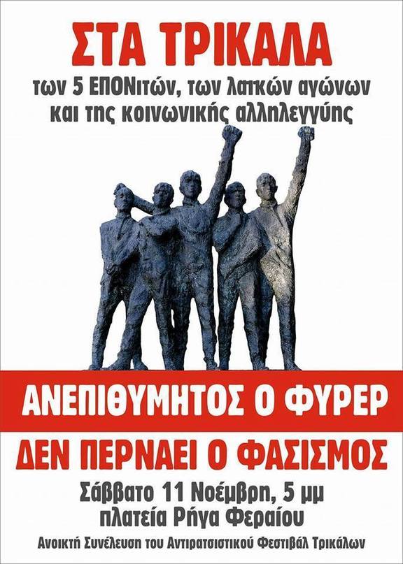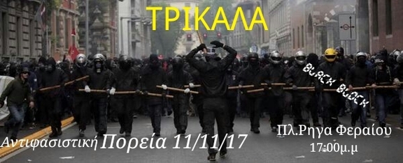 Όλοι στην πανθεσσαλική αντιφασιστική συγκέντρωση και πορεία το Σάββατο 11/11 στις 17:00 στην πλατεία Ρ. Φεραίου στα Τρίκαλα.