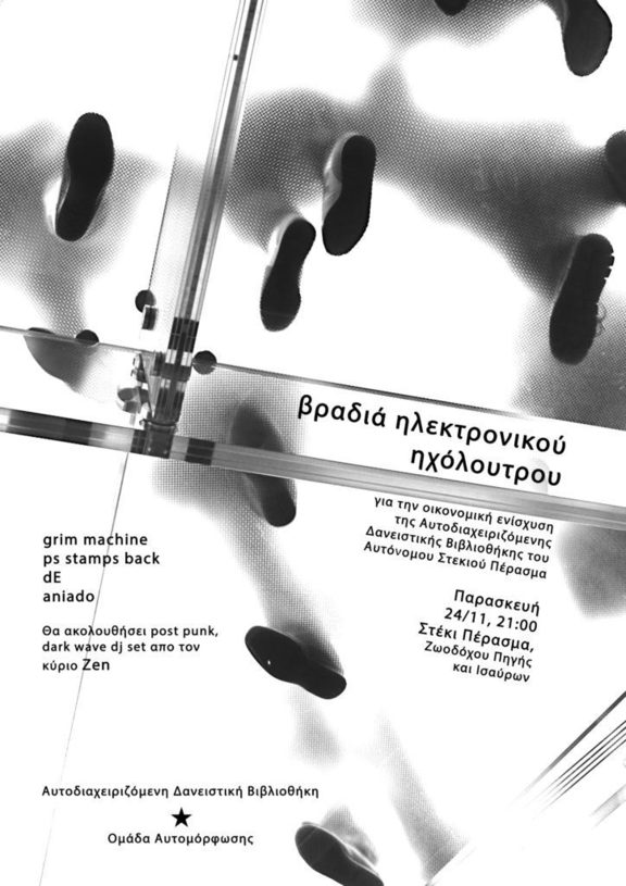 Για την ευόδωση αυτού ακριβώς του σκοπού, διοργανώνουμε την Παρασκευή 24/11 μια βραδιά ηλεκτρονικού ηχόλουτρου, την οποία θα ακολουθήσει ένα DJ Set Post-Punk/ Dark Wave. Μέρος των εσόδων θα διατεθεί για την απόκτηση του σκοτεινού αντικείμενου του -βιβλιοθηκονομικού- μας πόθου: ενός αφυγραντήρα.