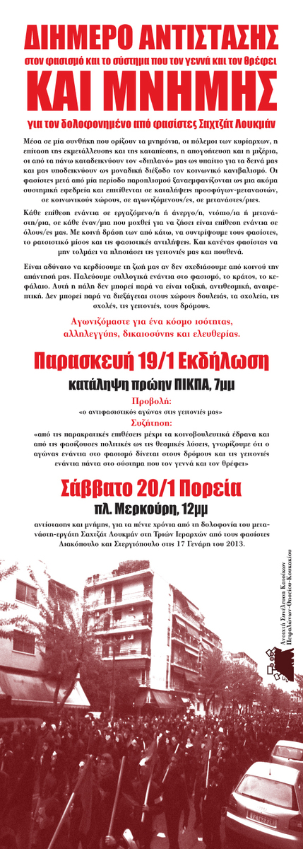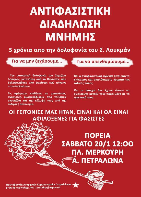 Στις 17 Ιανουαρίου 2013 δολοφονείται ο μετανάστης εργάτης Σαχζαντ Λουκμάν στην περιοχή των Ανω Πετραλώνων απο τους φασίστες Χρηστο Στεργίοπουλο και Διονύση Λιακόπουλο. Η ημέρα αυτή, ημέρα μνήμης και αντίστασης, έρχεται μέσα σε μία περίοδο όπου η πολιτική και οικονομική ελίτ οξύνει τον πόλεμο που έχει κηρύξει στους από τα κάτω. Ο πόλεμος στην καπιταλιστική περιφέρεια και οι καταστροφικές συνέπειές του εξαπλώνονται συνεχώς, οι δολοφονίες προσφύγων και μεταναστών στα σύνορα της Ευρώπης φρούριο συνεχίζονται με αμείωτη ένταση και σε συνδυασμό με τον εγκλεισμό τους, την απομόνωσή τους σε στρατόπεδα συγκέντρωσης και τις απελάσεις, συνθέτουν την πολιτική του ελληνικού κράτους.