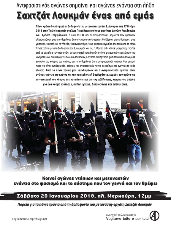 Πριν 5 χρόνια ο Σαχτζάτ Λουκμάν, μετανάστης εργαζόμενος σε φούρνους και λαϊκές αγορές στην Αθήνα, δολοφονείται με μαχαίρια στις 3 τα ξημερώματα, την ώρα που πήγαινε στη δουλειά του, από τους νεοναζί Χρήστο Στεργιόπουλο και Διονύση Λιακόπουλο. Στην Τριών Ιεραρχών 67 οι γειτονιές μας ήρθαν ξανά αντιμέτωπες με τη βιαιότητα του φασισμού και του ρατσισμού. Από τότε η 17η Ιανουαρίου είναι ημέρα μνήμης, οργής και αντίστασης. Μιας μνήμης που παραμένει ζωντανή γιατί ο κόσμος του αγώνα δεν αφήνει να ξεχαστεί. Μίας οργής γιατί χάθηκε ακόμα ένας από εμάς. Μίας αντίστασης που εκδηλώθηκε από την πρώτη στιγμή συλλογικά από αναρχικούς, αντιφασίστες, αριστερούς, αγωνιζόμενους κατοίκους τόσο στις γειτονιές μας αλλά και ευρύτερα που ανέδειξαν πως η δολοφονία του Σ. Λουκμάν δεν αποτελεί ένα μεμονωμένο γεγονός. Οι επιθέσεις σε σπίτια, σε χώρους εργασίας, στους δρόμους, τα μαχαιρώματα, οι ξυλοδαρμοί και ο διαρκής φόβος είναι η πραγματικότητα που αντιμετωπίζουν πολλοί μετανάστες. Από τις γειτονιές του Ρέντη και του Ασπροπύργου, μέχρι το Μενίδι και τη Νέα Ιωνία, από τα στρατόπεδα συγκέντρωσης, το κολαστήριο της Πέτρου Ράλλη μέχρι τη Μεσόγειο και τα σύνορα, πρόσφυγες και μετανάστες βιώνουν καθημερινά τη βαρβαρότητα του κράτους και του κεφαλαίου.