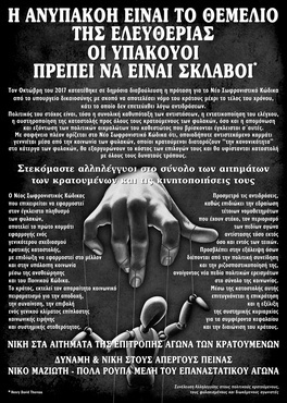 Συμμετέχουμε και καλούμε Σάββατο 16 Δεκεμβρίου στη συγκέντρωση-πορεία αλληλεγγύης στον αγώνα των κρατουμένων ενάντια στο Νέο Σωφρονιστικό κώδικα. Στεκόμαστε αλληλέγγυοι στους απεργούς πείνας από 11/11 Νίκο Μαζιώτη και Πόλα Ρούπα, και στον αγώνα των κρατουμένων ενάντια στο νέο σωφρονιστικό κώδικα, που ξεκίνησε στις 26/9 από την Επιτροπή αγώνα γυναικείων - αντρικών φυλακών Κορυδαλλού (πτέρυγες Α, Β, Γ, Δ και Α' παράρτημα υπογείου καταστήματος) και διευρύνετε σε 5 φυλακές της Ελλάδας(Λάρισσας, Δομοκού, Μαλανδρίνου, Αλικαρνασσού, Χανίων).