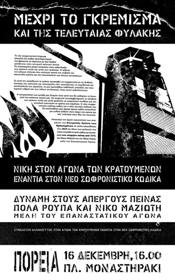 Καλούμε Σάββατο 16 Δεκεμβρίου σε συγκέντρωση-πορεία αλληλεγγύης, στους απεργούς πείνας από 11/11 Νίκο Μαζιώτη και Πόλα Ρούπα, και στον αγώνα των κρατουμένων ενάντια στο νέο σωφρονιστικό κώδικα, που ξεκίνησε στις 26/9 από την Επιτροπή αγώνα γυναικείων - αντρικών φυλακών Κορυδαλλού (πτέρυγες Α, Β, Γ, Δ και Α' παράρτημα υπογείου καταστήματος) και επεκτείνεται σε 5 φυλακές της χώρας.