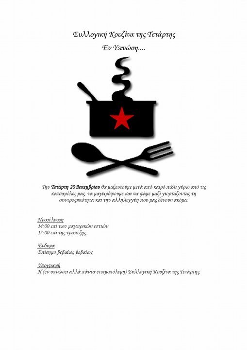 Την Τετάρτη 20 Δεκεμβρίου θα μαζευτούμε μετά από καιρό πάλι γύρω από τις κατσαρόλες μας, να μαγειρέψουμε και να φάμε μαζί γιορτάζοντας τη συντροφικότητα και την αλληλεγγύη που μας δένουν ακόμα.