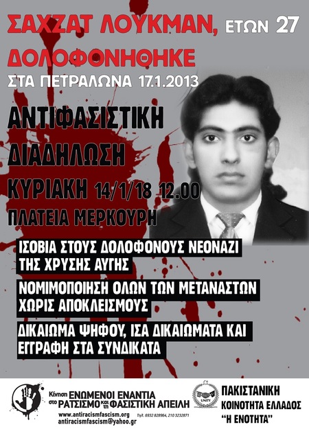 Την Κυριακή 14 Γενάρη 2018 διαδηλώνουμε αντιφασιστικά και αντιρατσιστικά με αφορμή τη συμπλήρωση 5 χρόνων από τη δολοφονία του Σαχζάτ Λουκμάν, του Πακιστανού εργάτη που μαχαιρώθηκε στην καρδιά στις 17 Γενάρη 2013 στα Πετράλωνα. Ο Σαχζάτ Λουκμάν, πήγαινε με το ποδήλατο του στη δουλειά και οι δύο νεοναζί του έκλεισαν το δρόμο με μηχανή, κατέβηκαν και τον μαχαίρωσαν εν ψυχρώ.