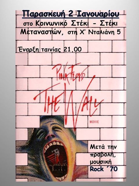 Προβολή της ταινίας " The Wall" του Pink Floyd. Ακολουθεί ροκ μουσική της δεκαετίας του 70.