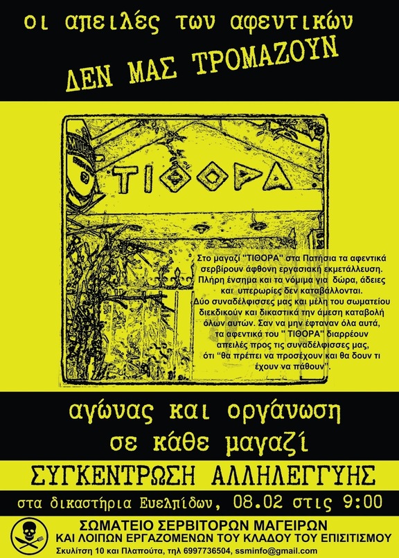 Ως σωματείο προτάσσουμε την αυτοοργάνωση και τις διεκδικήσεις στους χώρους δουλειάς και θεωρούμε υπεύθυνη την εργοδοσία του ΤΙΘΟΡΑ και τα τσιράκια της για οτιδήποτε συμβεί στις συναδέλφισσές μας. Άλλωστε οι απειλές της εργοδοσίας δεν είναι καινούριο φαινόμενο, τις έχουμε αντιμετωπίσει στο παρελθόν σε μαγαζιά. Τα «θα δούνε τι θα πάθουν» και «δεν ξέρουν πού έμπλεξαν» όχι μόνο δεν μας τρομάζουν, μας εξοργίζουν.