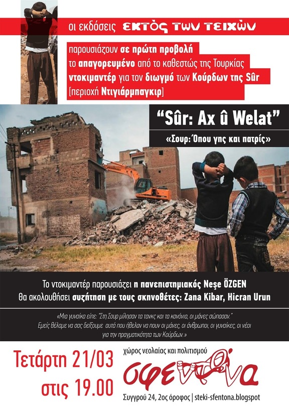 Οι εκδόσεις "εκτός των τειχών" παρουσιάζουν σε πρώτη προβολή το απαγορευμένο από το καθεστώς της Τουρκίας ντοκιμαντέρ για τους διωγμούς των Κούρδων της Sûr (περιοχή Ντιγιάρμπακιρ):