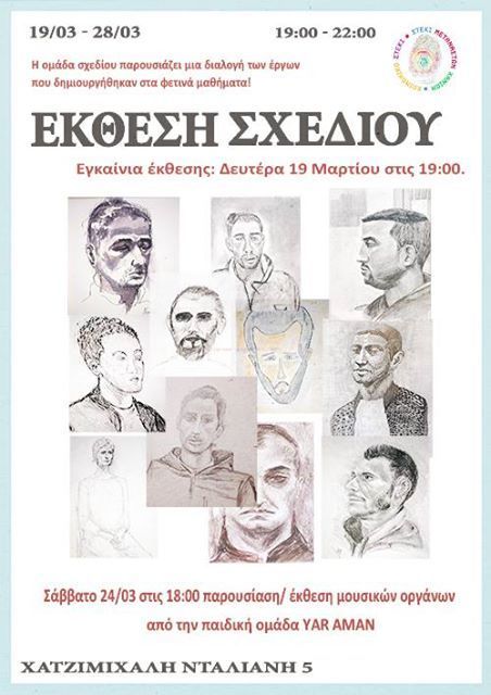 Aπό τη Δευτέρα 19-3 έως την Τετάρτη 28-3 η ομάδα σχεδίου-ζωγραφικής του στεκιού θα πραγματοποιήσει την πρώτη έκθεσή της! Η ομάδα λειτουργεί για δεύτερη χρονιά: (μία φορά τη βδομάδα μαζευόμαστε στο στέκι μεταναστών και σχεδιάζουμε εκ του φυσικού από μοντέλο). Τα άψογα μοντέλα μας είναι συνήθως μετανάστες πρόσφυγες αλλά και φίλοι μουσικοί!
