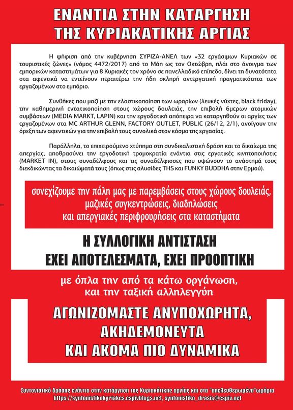 Ο αγώνας ενάντια στην κατάργηση της Κυριακάτικης αργίας είναι ένα ακόμα πεδίο αγώνα όπου διεκδικούμε και μαχόμαστε για τις ανάγκες μας. Κάνοντας πράξη την ταξική αλληλεγγύη και την αυτό-οργάνωση αντιστεκόμαστε σε ένα ακόμα μέτρο καθυπόταξης και στεκόμαστε απέναντι σε κάθε κίνηση υποτίμησης των ζωών μας. Η υπεράσπιση της κυριακάτικης αργίας, όπως ο αγώνας ενάντια στους πλειστηριασμούς κατοικιών, ο αγώνας για ελεύθερες μετακινήσεις, οι κινήσεις αλληλεγγύης σε πρόσφυγες και μετανάστες, ο αγώνας για την υπεράσπιση των καταλήψεων και κάθε αγώνας που στήνει αναχώματα ενάντια στην καπιταλιστική βαρβαρότητα, αποτελεί μονοπάτι στην κατεύθυνση της κοινωνικής απελευθέρωσης, όπου οι από τα κάτω αυτού του κόσμου θα ορίζουν τις ζωές τους, και μέρος του ευρύτερου αγώνα για έναν κόσμο ισότητας, αλληλεγγύης και ελευθερίας, για την κοινωνική επανάσταση, την αναρχία και τον κομμουνισμό.