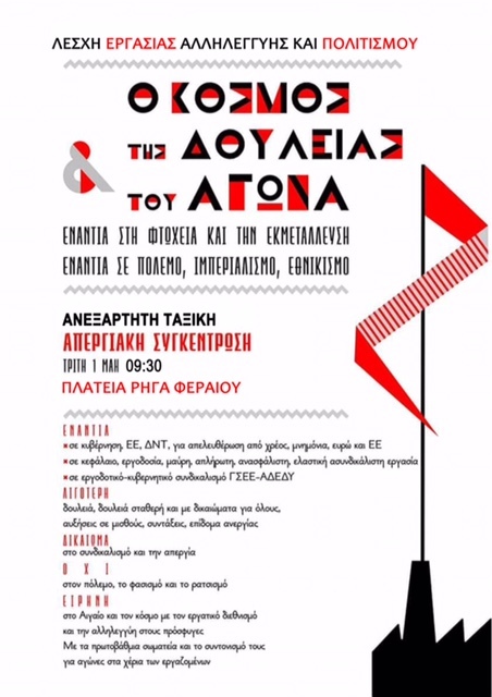 Καλούμε σε ανεξάρτητη ταξική Πρωτομαγιάτικη προ-συγκέντρωση στις 9:30π.μ. στην πλατεία Ρήγα Φεραίου, και πορεία προς Κεντρική πλατεία, Εργατικό κέντρο και το κέντρο της πόλης.