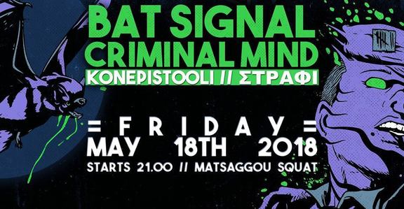 Η ημερομηνία είναι 29 Οκτωβρίου 2016 και ο χώρος είναι κάποιο υπόγειο club στη Βουδαπέστη. Οι Criminal Mind έχουν κλείσει ένα live στο οποίο οι Bat Signal έχουν προστεθεί την τελευταία στιγμή, σε ένα από τα τελευταία live της περιοδείας τους. Η αλήθεια είναι πως σε ένα tour, υπάρχουν μερικές καλές και μερικές… λιγότερο καλές βραδιές, αλλά αυτή η βραδιά ήταν από τις σπάνιες μαγικές στιγμές που χαρακτηρίζονται από μια χημεία που μόνο η μουσική μπορεί να δημιουργήσει. Το συμπέρασμα ήταν ένα: «Πρέπει να το ξανακάνουμε». Fast forward στο 2018. Οι Bat Signal δεν δραστηριοποιούνται επίσημα εδώ και έναν χρόνο, πλέον έχουν νέο Line Up και είναι έτοιμοι να βγουν για πρώτη φορά σε Ελληνικό tour. Οι Criminal Mind έχουν παίξει αμέτρητα live σε όλη τη Μεγάλη Βρετανία. Αυτή τη φορά ο χώρος είναι η Ελλάδα, και ο χρόνος ο Μάιος του 2018 και στον εκρηκτικό συνδυασμό προστίθεται ο Φινλανδικός 80s hardcore όλεθρος των Konepistooli απο την Αθήνα και το Ελληνόφωνο Punk Rock των Στράφι απο τη Λάρισα!!