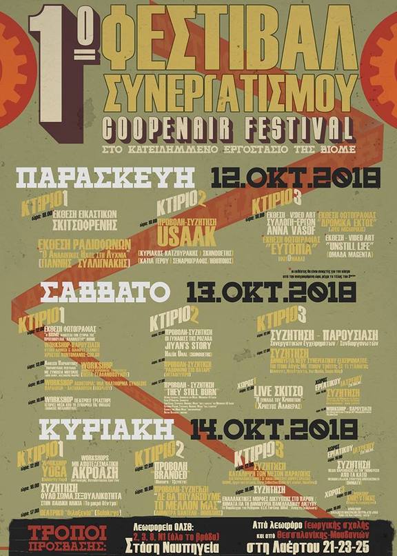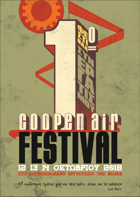 Μια εβδομάδα έμεινε ακόμα για το 1ο Φεστιβάλ Συνεργατισμού CoOpenAir Festival, και αποδεικνύεται ότι ο καλύτερος τρόπος για να πεις κάτι είναι να το κάνεις. Με προσπάθεια όλων των συμμετεχόντων το φεστιβάλ είναι έτοιμο να ανοίξει τις πύλες του και να υποδεχθεί όλους όσους φαντάζονται μια διαφορετική κοινωνία αυτοοργανωμένη, στο ανακτημένο εργοστάσιο της ΒΙΟΜΕ στη Θεσσαλονίκη στις 12, 13 και 14 Οκτωβρίου. Μέσα από πολιτιστικές εκδηλώσεις, συναυλίες, εκθέσεις, συζητήσεις και workshops, αναδεικνύουμε τα ζωντανά παραδείγματα συνεργατικών εγχειρημάτων που εργάζονται και λειτουργούν ριζοσπαστικά.