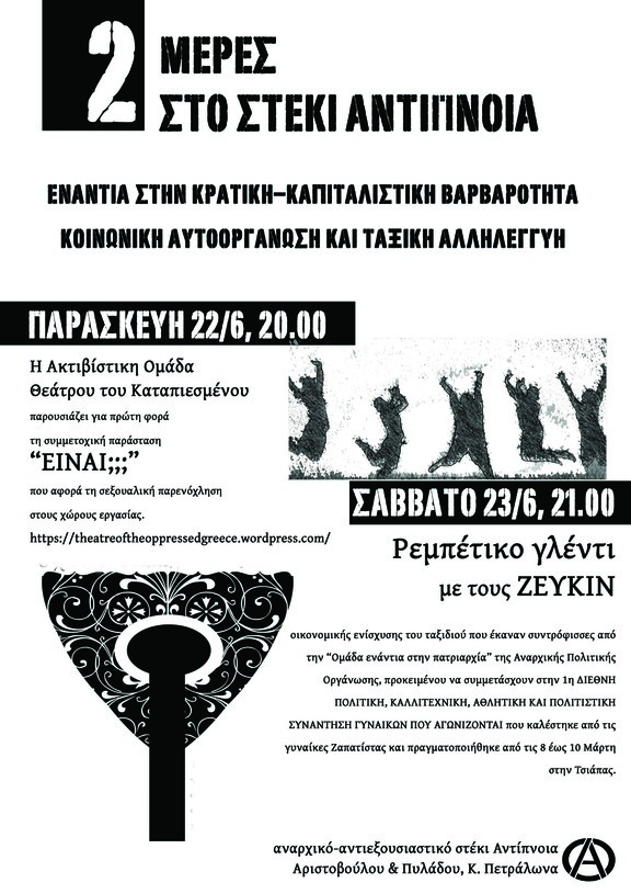 Σάββατο 23 Ιούνιου στις 21:00 Ρεμπέτικο γλέντι, με τους ΖΕΥΚΙΝ, οικονομικής ενίσχυσης του ταξιδιού που έκαναν συντρόφισσες από την "Ομάδα ενάντια στην πατριαρχία" της Αναρχικής Πολιτικής Οργάνωσης, προκειμένου να συμμετάσχουν στην 1η ΔΙΕΘΝΗ ΠΟΛΙΤΙΚΗ, ΚΑΛΛΙΤΕΧΝΙΚΗ, ΑΘΛΗΤΙΚΗ ΚΑΙ ΠΟΛΙΤΙΣΤΙΚΗ ΣΥΝΑΝΤΗΣΗ ΓΥΝΑΙΚΩΝ ΠΟΥ ΑΓΩΝΙΖΟΝΤΑΙ που καλέστηκε από τις γυναίκες Ζαπατίστας και πραγματοποιήθηκε από τις 8 έως 10 Μάρτη στην Τσιάπας.